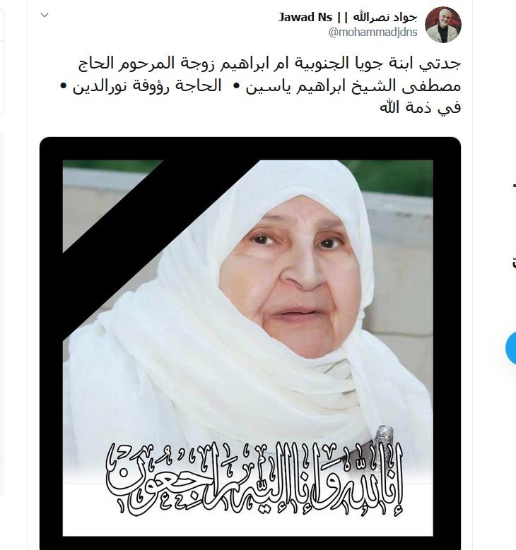 سید جواد نصرالله در توئیتی نوشت : مادربزرگم، حاجیه رؤوفة نورالدین،ام ابراهیم از اهالی «جویا» در جنوب لبنان، همسر مرحوم حاج مصطفی شیخ ابراهیم یاسین به رحمت خدا رفت.